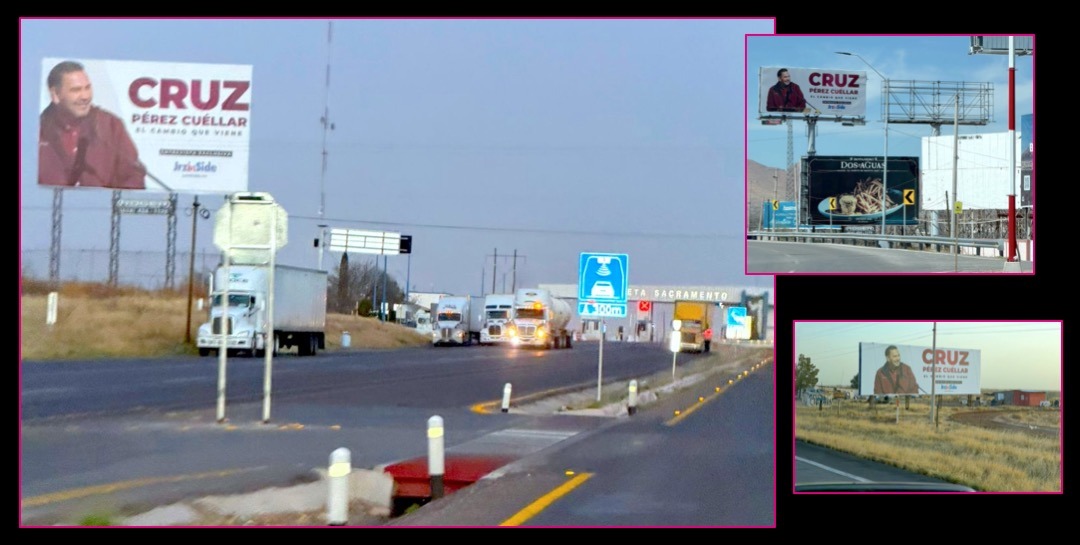 El alcalde de Ciudad Juárez, Cruz Pérez Cuéllar, continúa colocando espectaculares con su imagen para promover su aspiración a la Coordinación de los Comités de Defensa de la Cuarta Transformación en Chihuahua, para las elecciones de 2027.