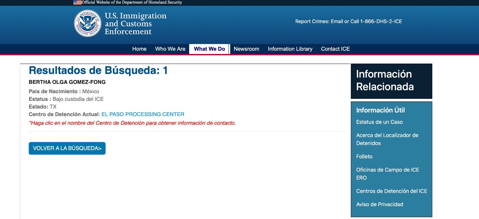 • Se encuentra detenida en El Paso Processing Center, de acuerdo con el Sistema de Localización de Detenidos en Línea del ICE.