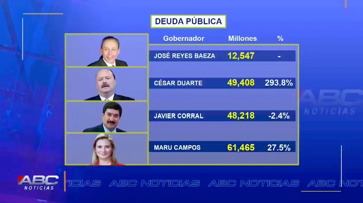 ABC Noticias de Canal 28 reprodujo el fragmento de una entrevista de Ana Francisca Vega, de MVS Noticias CDMX, con la gobernadora María Eugenia Campos Galván, quien culpó a Javier Corral de la deuda pública contratada por César Duarte.