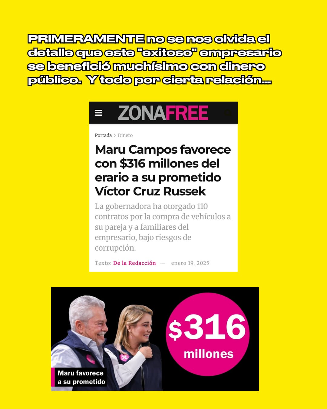 • La gobernadora otorgó contratos por cientos de millones de pesos a Cruz Russek antes y después de casarse, en operaciones bajo riesgos de corrupción y evidentes conflictos de interés que las autoridades fiscalizadoras se han negado a investigar y sancionar.