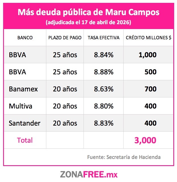 La gobernadora María Eugenia Campos Galván adjudicó la contratación de nueva deuda pública por $3 mil millones de pesos a pagar hasta en 25 años, con tasas efectivas de interés que alcanzan 8.88%.