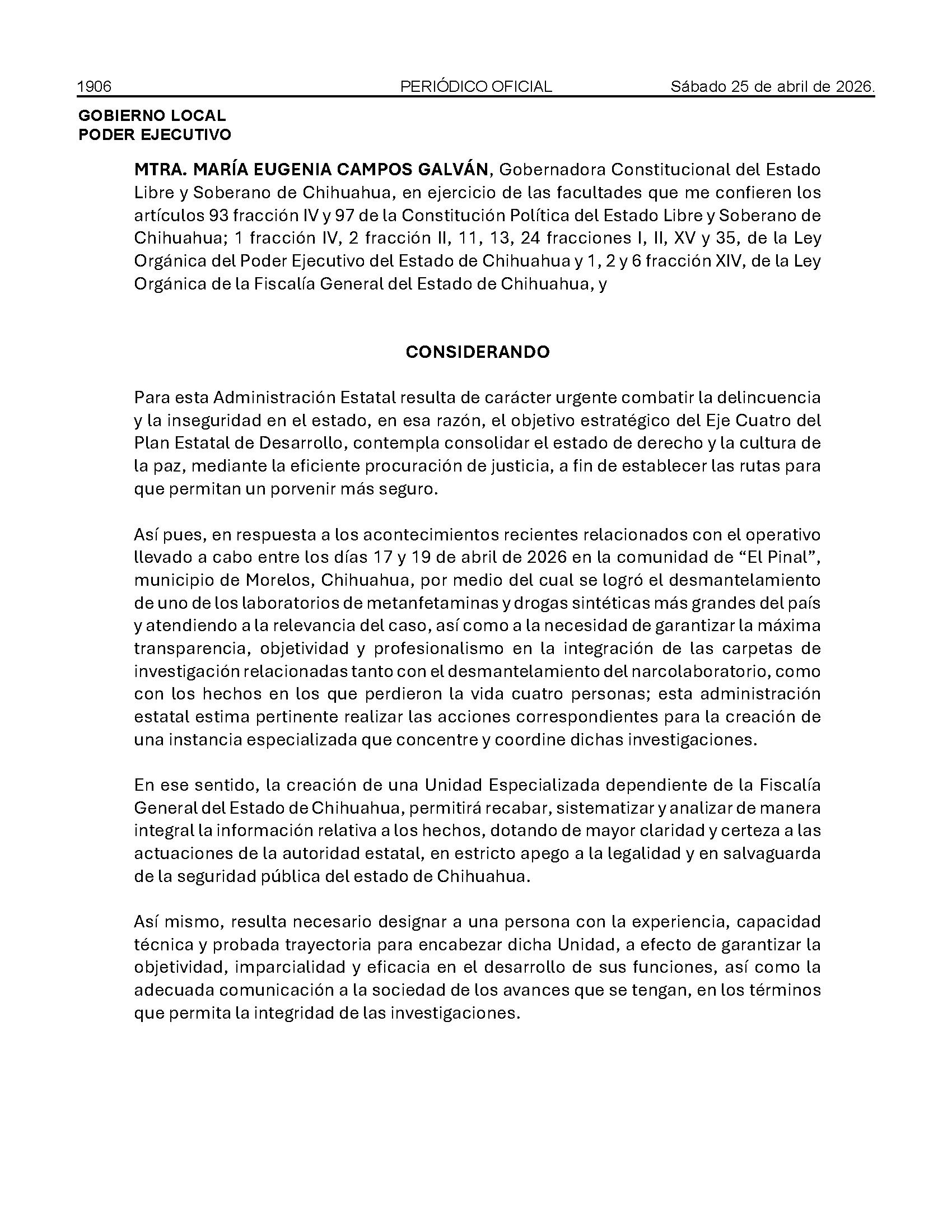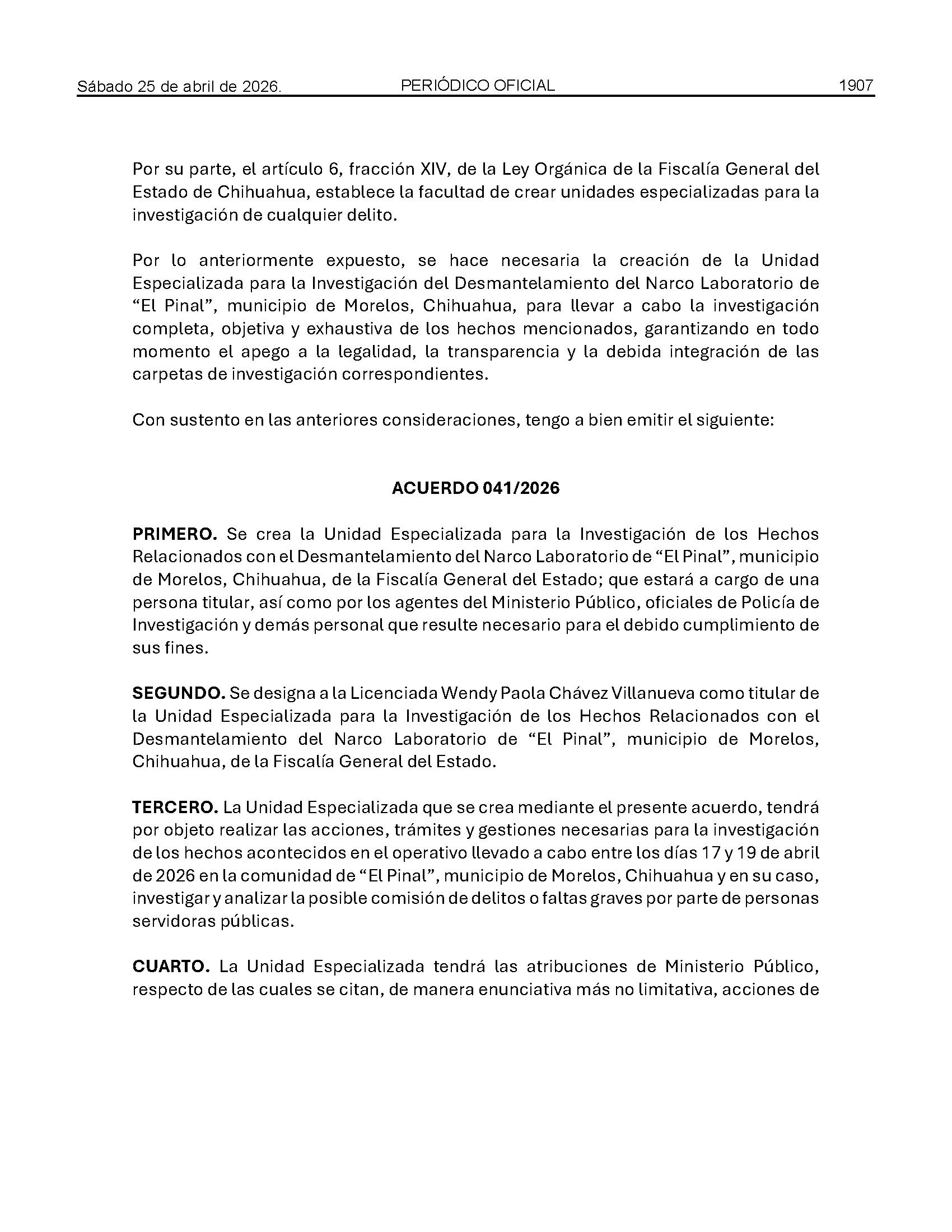 El Periódico Oficial del Estado publicó el Acuerdo 041/2026 por el cual se crea la “Unidad Especializada para la Investigación de los Hechos Relacionados con el Desmantelamiento del Narco Laboratorio de El Pinal”, en el municipio de Morelos, Chihuahua, pero en realidad es una farsa.