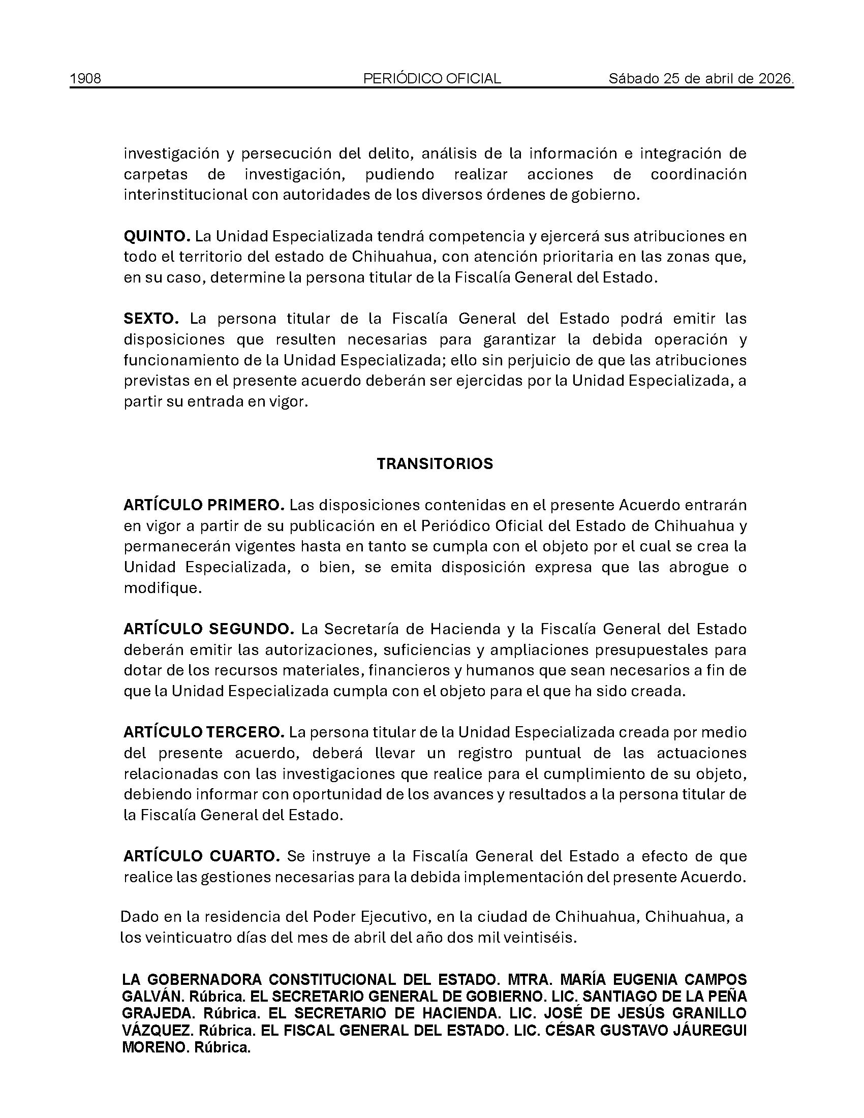 El Acuerdo entró en vigor en la fecha de su publicación, el sábado 25 de abril de 2026 y permanecerá vigente “hasta en tanto se cumpla con el objeto por el cual se crea la Unidad Especializada, o bien, se emita disposición expresa” que lo abrogue o modifique.
