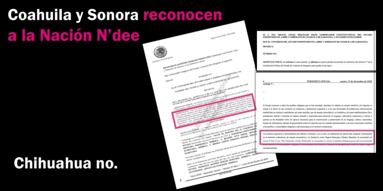 Coahuila y Sonora reconocen los derechos de la Nación N’dee. Chihuahua se los niega Texto: De la Redacción octubre 20, 2023 2.8k Poder Los Congresos y gobiernos de Coahuila y Sonora han reconocido los derechos del pueblo N’dee o N’nee o Ndé mediante... Saber más